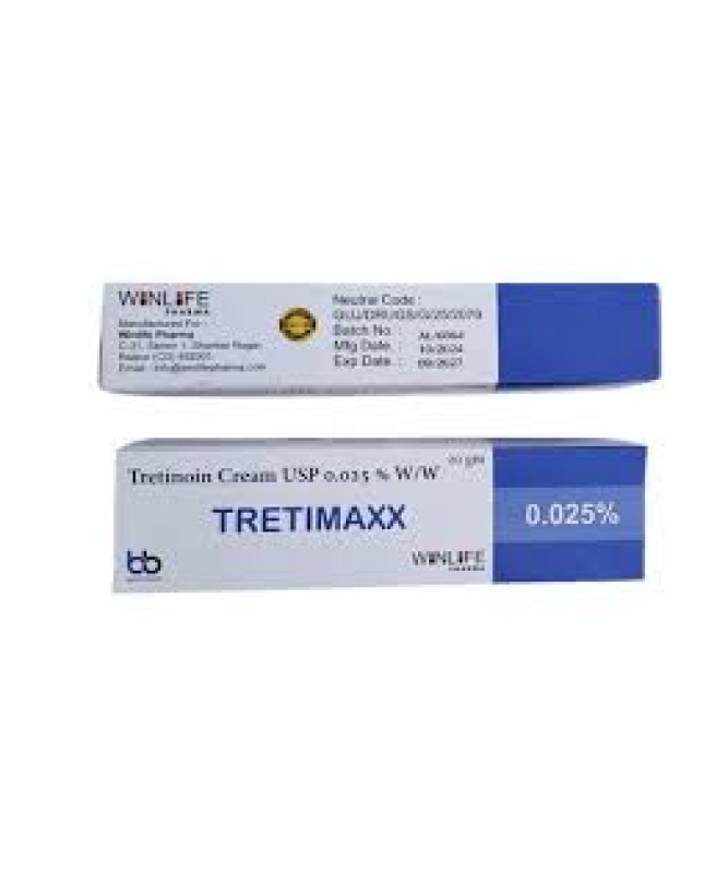 Tretimaxx 0.025% is a topical cream containing Tretinoin 0.025%, a derivative of vitamin A that promotes healthy skin renewal. It is widely used in dermatology to treat acne vulgaris, clogged pores, and early signs of aging such as fine lines, rough texture, and sun spots.